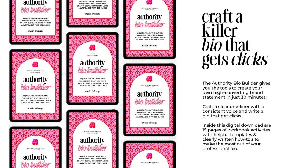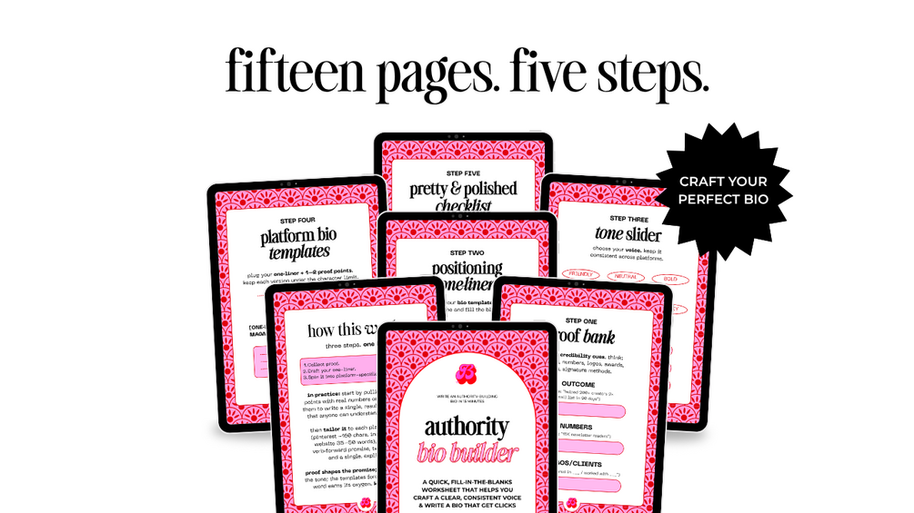 Write a bio that sells the click. The Authority Bio Builder Workbook helps you define your message, prove your credibility, and craft a bio that gets attention — fast. Perfect for creators ready to sound confident, not corporate.