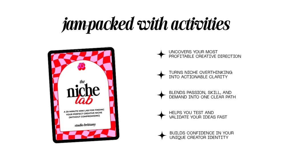 Meet The Niche Lab — a guided niche discovery workbook for creative entrepreneurs, personal brands, and multi-hyphenate creators who are over the guesswork. In ~20 minutes, you’ll cross-match passions, skills, and profit potential to uncover your most aligned micro-market—no corporate jargon, no hustle worship, just clarity that actually feels good.